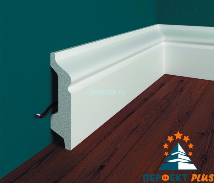 Напольный плинтус Перфект Плюс из белого ударопрочного полимера — это прочный и надежный элемент для отделки стыков между стенами и полом.
