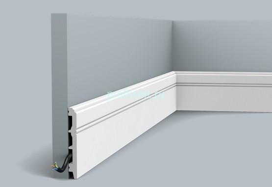 Плинтус длиной 2 м из полистирола с интегрированным кабель-каналом, обеспечивает аккуратное скрытие проводов.